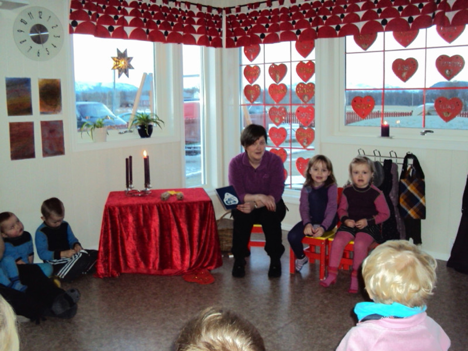Hver dag har vi felles adventsstund inne i barnehagen. Da trekker vi adventshjerter til alle barna og der står det hyggelige ting om hvert enkelt barn! Vi synger mange julesanger og i tilegg leser vi fortellingen 24 dager til jul. Det handler om 2 mus som heter Magnuso og Erlando. De forbereder seg til jul, men mye kan skje i ett lite museliv.....