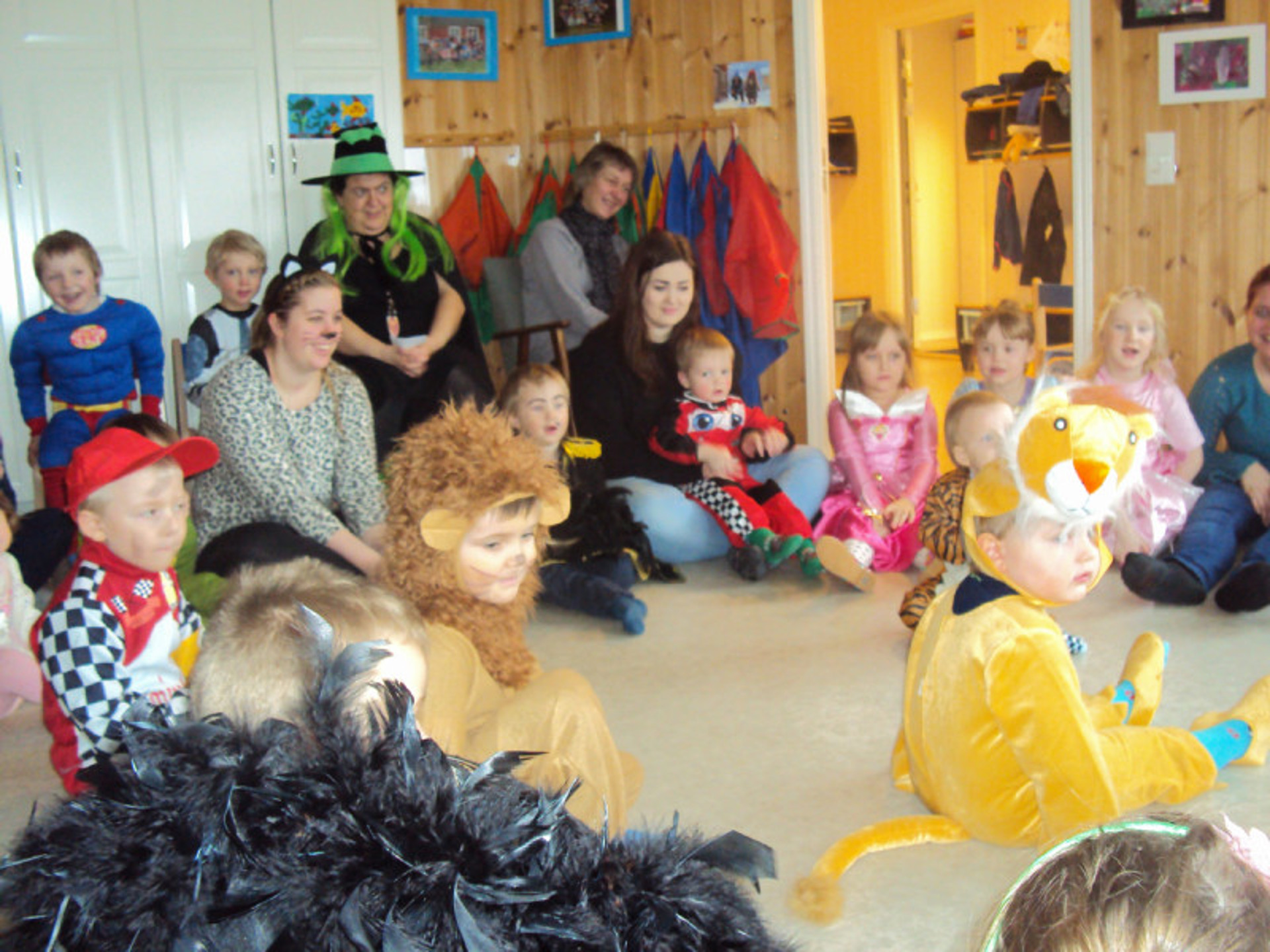 Vi starta dagen med skikkelig disco-musikk; både små og store fikk svingt seg skikkelig i takt med musikken. Etterpå ble det gjennomført samlingsstund der alle fikk vist frem kostymene sine ordentlig. Det var både skumle dyr, vakre prinsesser, sterke supermenn og mange andre skapninger. Mange flotte kostymer! Etterpå solgte storklubben pølser til alle oss andre. Pengene hadde de tegnet og klipt ut selv. Vi avslutta hele karnevalet med å slå på ei flott Pinjata-mus. Alle fikk prøve å slå med pinnen før endelig "innmaten" kom ut. Godterier i barnehagen er sjelden vare!
