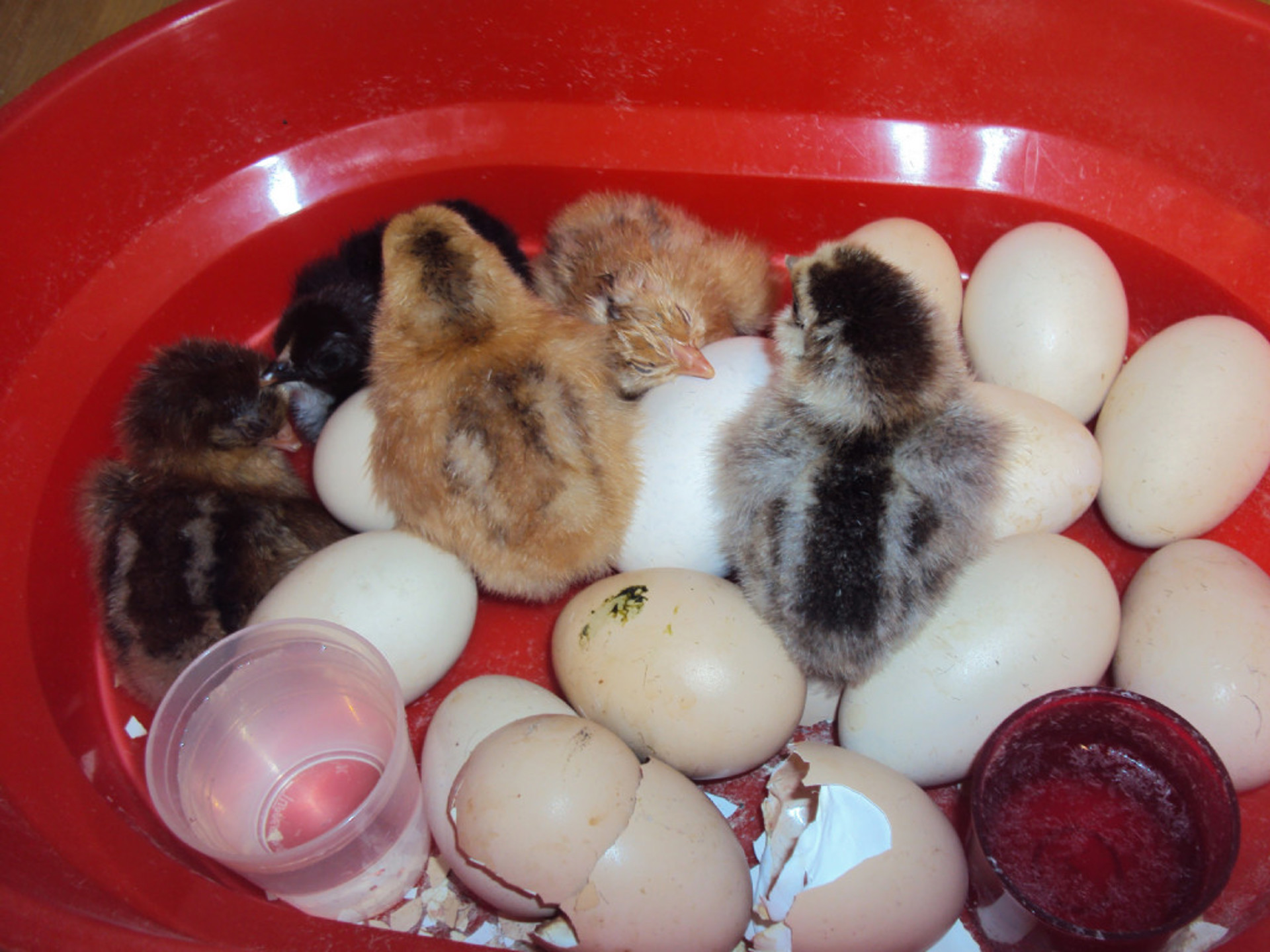 I ca 20 dager har vi ventet på at det skulle komme kyllinger og i går hørte vi endelig de første "pipene" fra rugekassa og den første lille kyllingen begynte å hakke seg ut av egget sitt. Nå er det kommet 5 stykker og enda venter vi på flere.....